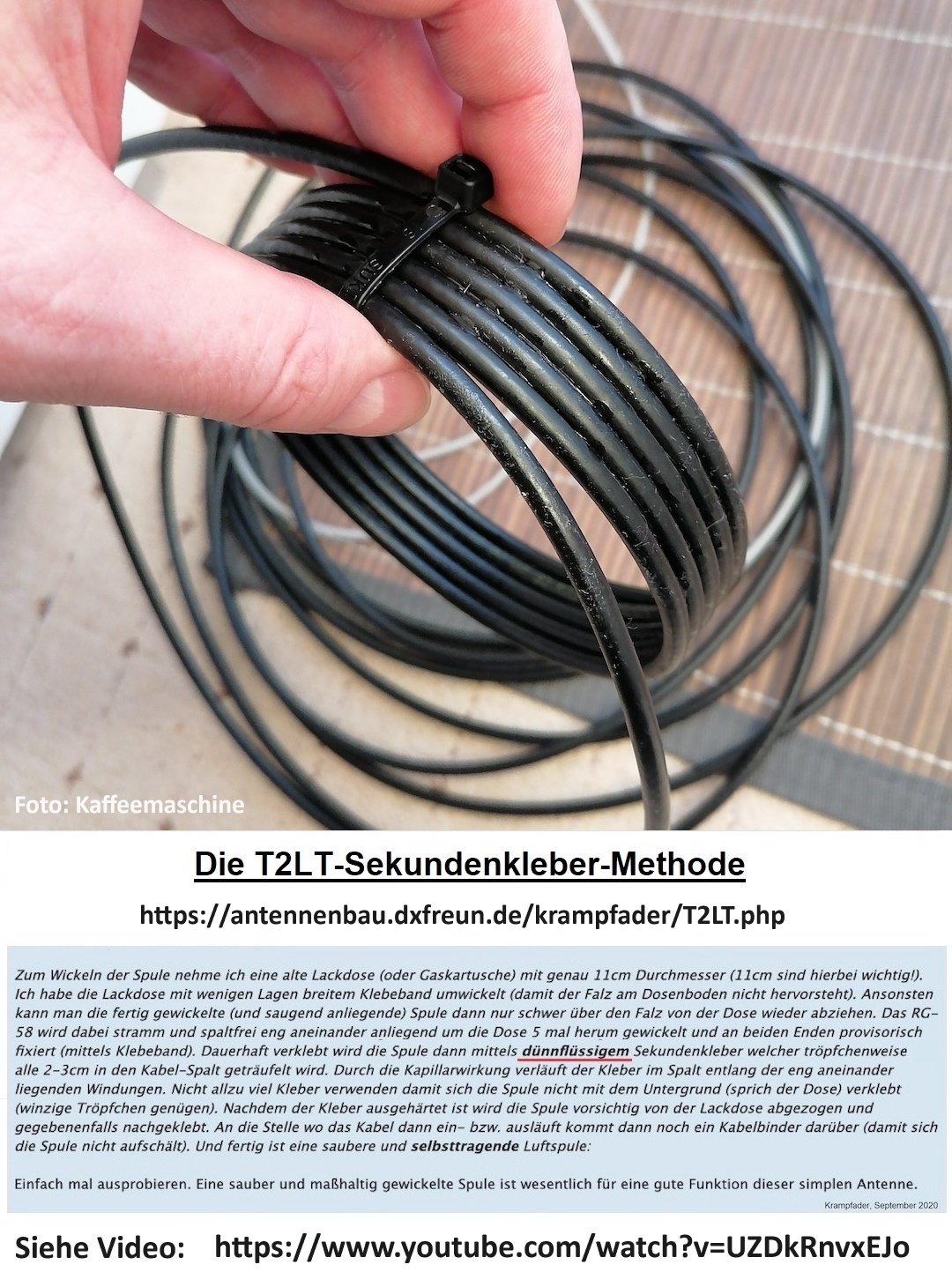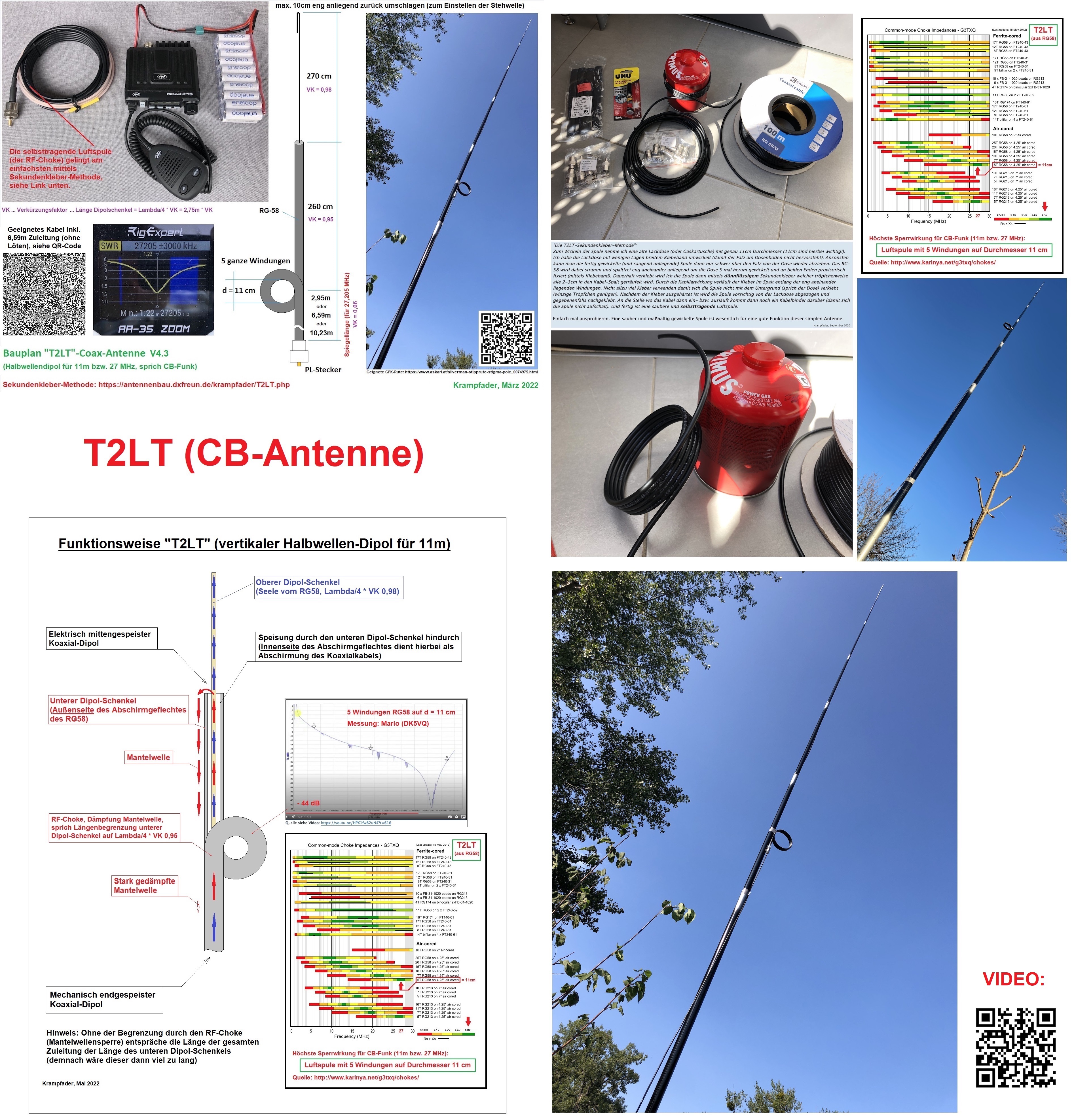 Die T2LT ist ein simpler, vertikaler und elektrisch mittengespeister Halbwellen- (bzw. Ärmel-) Dipol welcher sich hinter kommerziellen Draht- (bzw. Alu-) Halbwellen nicht zu verstecken braucht, trotz einfachster Bauweise. Die T2LT benötgt (wie jede Antenne) freies Feld und einen gewissen Mindestabstand zum Boden. Bereits an einer 9m-Askari (aus reinstem GFK bzw. Fiberglas ** ) arbeitet sie besser als jede Mobil-Antenne am KFZ-Blechdach
